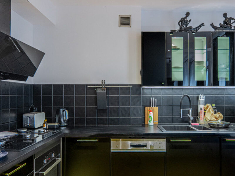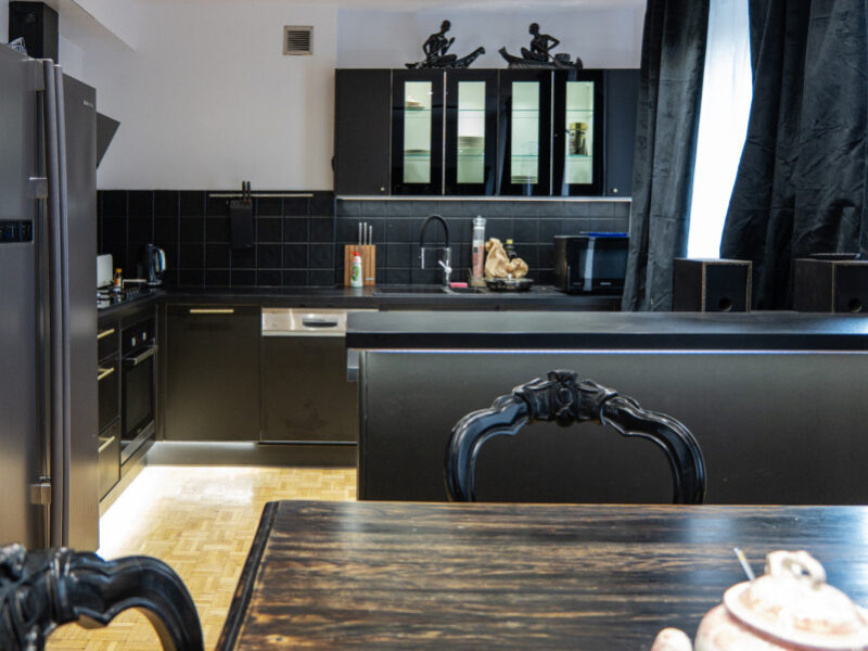 Mieszkanie zachwyca klimatem nowoczesnej klasyki z nutą glamour – elegancka kuchnia, drewniana podłoga i starannie dobrane dodatki tworzą przytulną, a zarazem stylową przestrzeń.