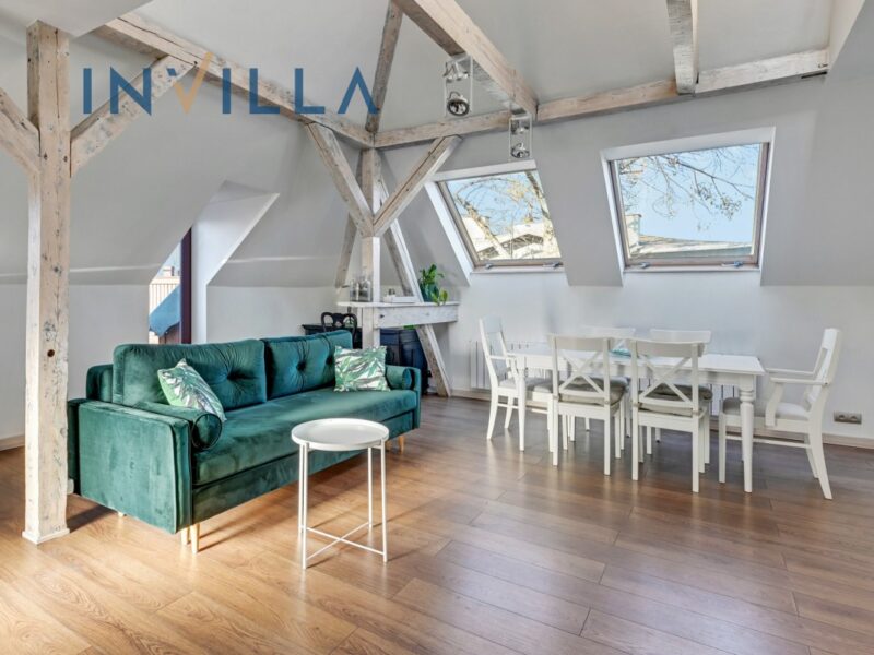 • pokój dzienny (z pokoju dziennego – wejście na antresolę) z wyjściem na przepiękny, niezwykle przestronny i doskonale nasłoneczniony taras wielkości ok.40 m2, z którego rozpościera się cudowny widok na dachy sopockich domów i kamienic