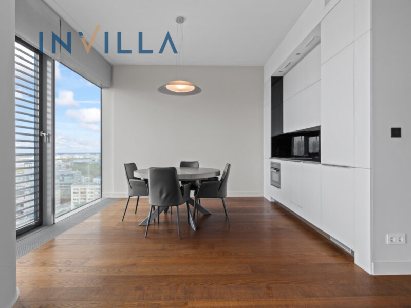 The 77 m² apartment located on the 17th floor features two spacious rooms, a bright living room, and a functional open kitchen connected to the living area. Large windows provide excellent natural light and stunning views of the Warsaw skyline.